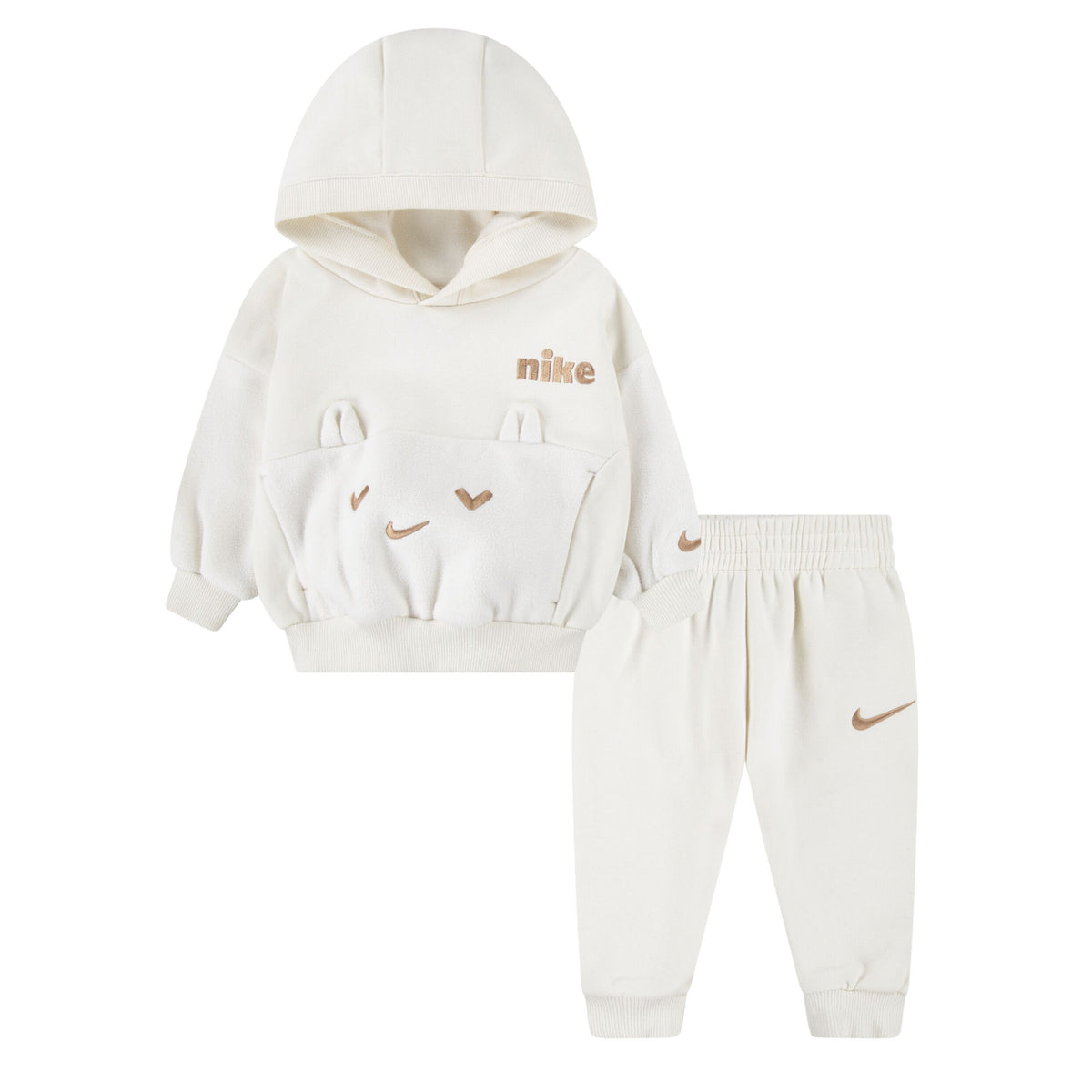 It's all in the details. This adorable Nike infant set has a cute animal face and ears on the front pocket. If that's not enough, this monochrome set is also roomy so they can play freely.