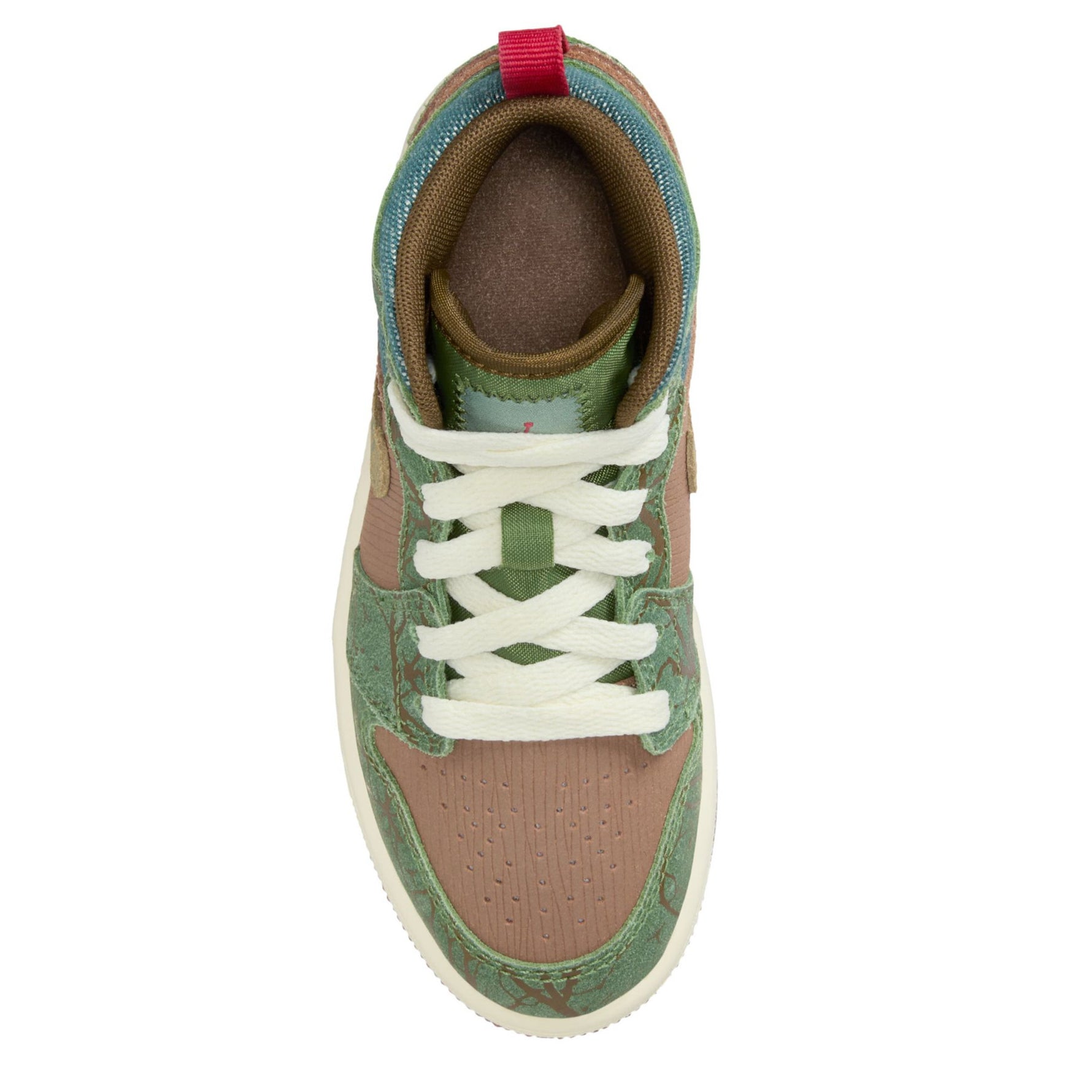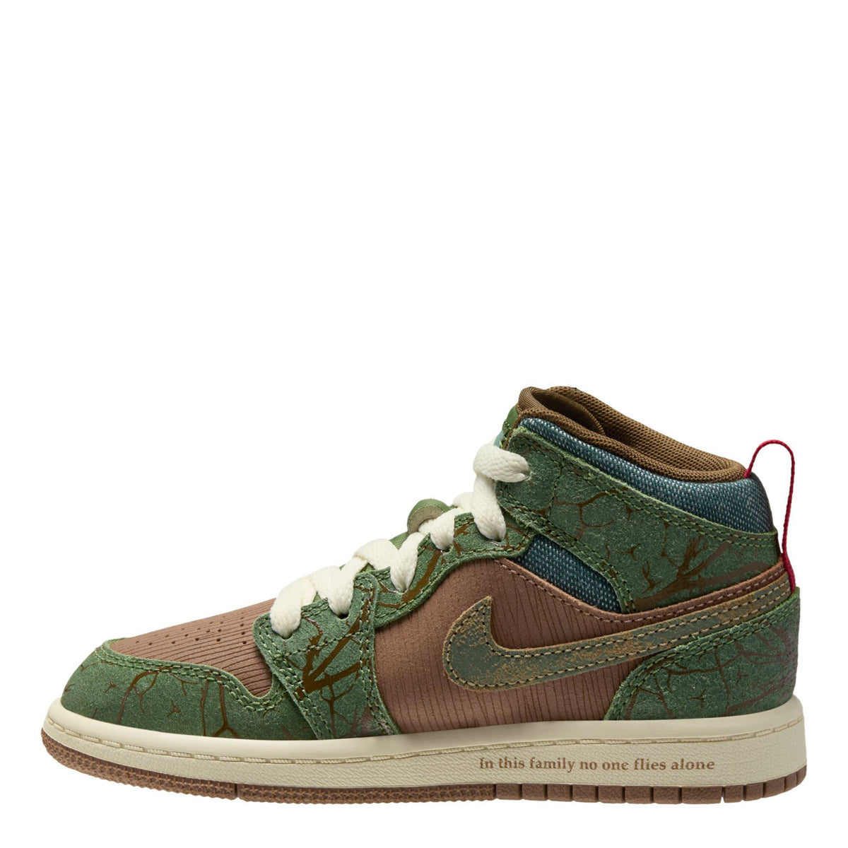This mini version of the Jordan 1 combines an iconic design with fresh new colors. Featuring tree-like accents and a padded collar, this lace-up shoe almost makes him want to take flight through the forest and beyond. The neutral color scheme fits right along with camo or jeans for a stylish look every wear.
